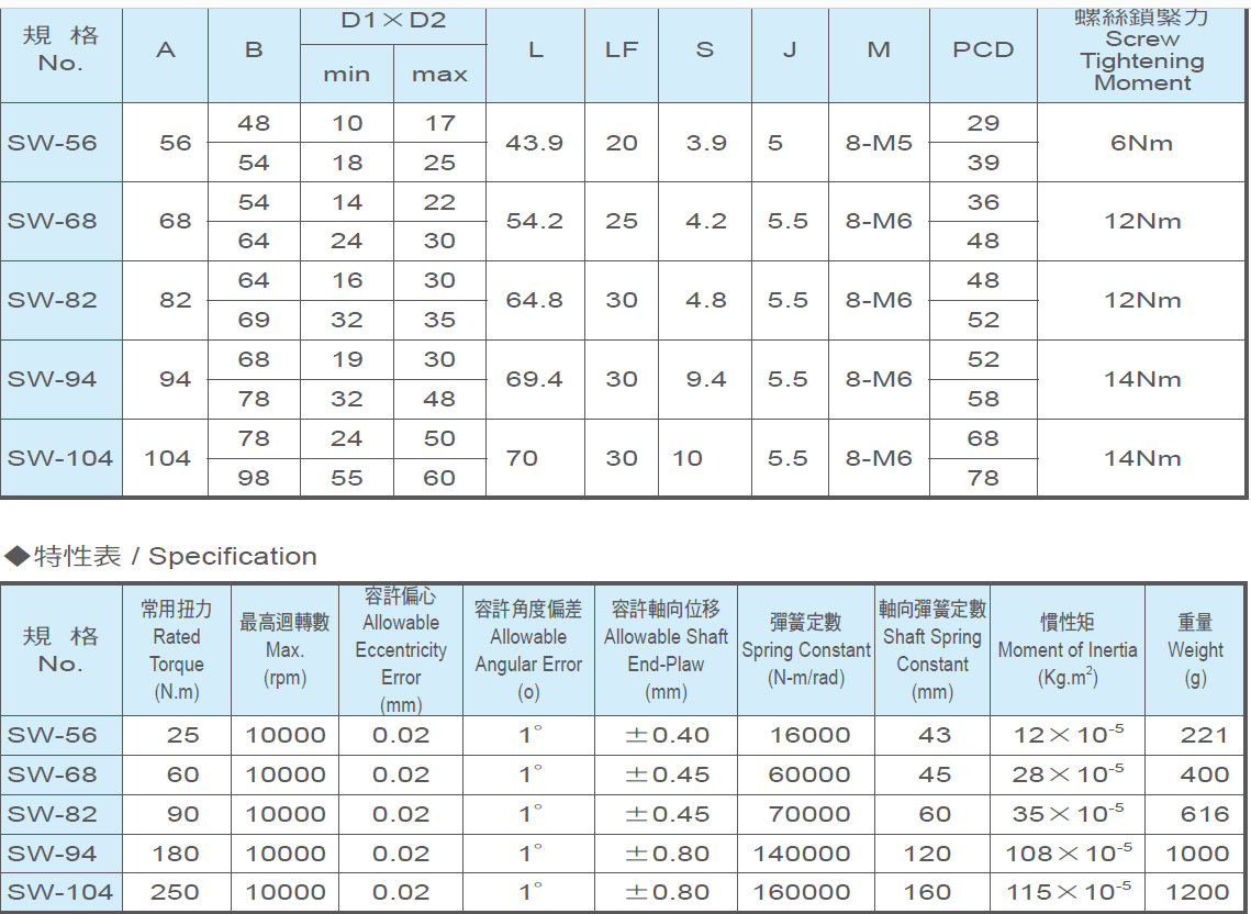 仕勛SW-56 SW-68 SW-82 SW-94高剛性.高扭矩聯(lián)軸器是連接兩軸使之供回轉(zhuǎn)並傳遞安全轉(zhuǎn)矩的一種機械裝置。一般聯(lián)軸器可分為撓性與剛性聯(lián)軸器兩